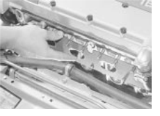 8 Remove the nuts which secure the manifold to the cylinder head. These are all stiff and some are not easily accessible; a socket with a "wobble drive" or universal joint will be needed. Once the nuts are removed, slide the manifold back on its studs to improve access to the injector wiring rail.