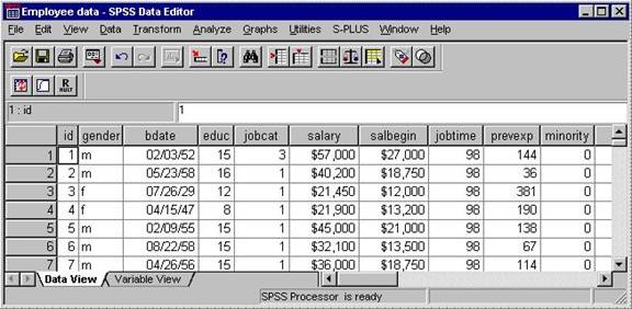 The Data Editor window displays the contents of the working dataset. It is arranged in a spreadsheet format that contains variables in columns and cases in rows. Notice how there are two tabs at the bottom of the window: Data View, and Variable View.