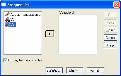 Now at the top of the screen click on Analyze / Descriptive Statistics / Frequencies. You should see the Frequencies window, which looks something like this: