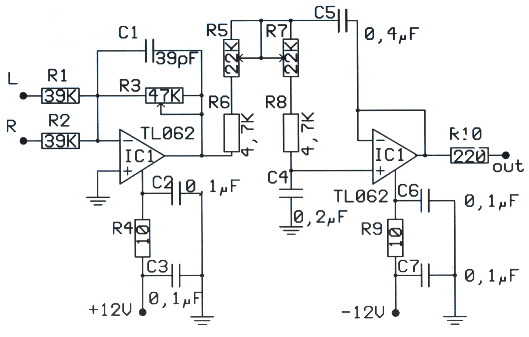 The price of reject is bigger than 80dB, their consumption is small, from 11 until 3 mA. They are internally sold in nutshell with eight pins and allocate two operational amplifiers, In the same line in nutshell 14 pins they incorporate four operational, In the trade they are sold with code TL074, TL084 and TL064, In nutshell with eight pins they are sold operational amplifiers TL061 TL071 kajTL081. In the manufacture we used the TL082 that has two operational. First operational from the TL082 it works as amplifier and mixed for the two channels, In his negative entry he exists one small mixed with two resistances. A potentiometer in this rung determines the aid of circuit. In the point this left winger and the right channel of preamplifier they are added means of two resistances. En continuity the operational strengthens signal with aid made dependent from the price that has the potentiometer.