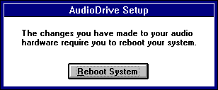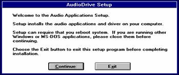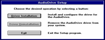 The first thing to do after entering Windows 3.1 or higher is to choose Run from the File Menu of the Program Manager. Next, place the Driver CD in a CD-ROM drive. In the Run dialog box, type the letter of the drive, directory and name of the program to be run (for example d:\mf1869\win31\setup) , then click the OK button. The AudioDrive Setup window appears.