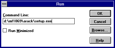 In the Run dialog box, type the drive, directory and name of the program to be run (e.g.. d:\mf1869\arack32\setup)