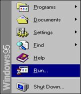 At the Windows 95 main display, click the Start Button on the lower left corner. Select RUN. Next place the Windows 95 utilities Driver Disk in the floppy drive.