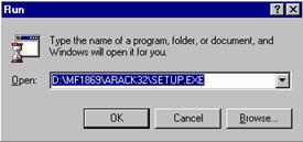 4 In the Run dialog box, type the drive, directory and name of the program to be run (e.g. d:\mf1869\arack\setup).