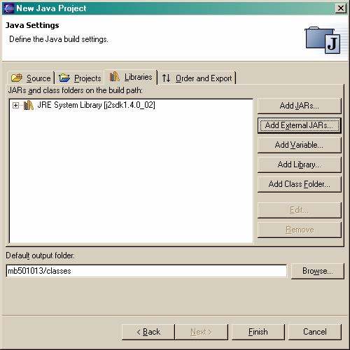 Open Libraries tab. By clicking "Add External JARs" specify all the jars we need for our source to compile.