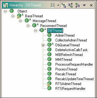 Opening type hierarchy for a class will show all its superclasses and implementing classes. For example, type hierarchy for DBThread will open the following view: