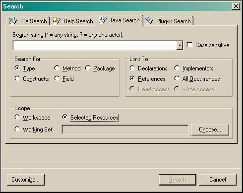 Search in working sets. Working set is a predefined logical grouping of classes in your project. For example, after selecting 'search in working set', you can define a set which contains only com.mind.common package and use it for searches in "common" only.