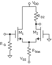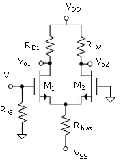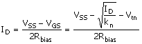 The equation for the dc circuit (Fig. 8.1) is the same as for the current-source common-source stage except that the bias resistor has current 2ID as the current from both transistors is flowing through this resistor. For now, the stage will be assumed to be perfectly balanced such that ID1 = ID2 = ID. The bias equation is