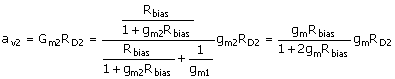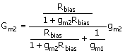 Parameter gm2 is the transconductance Id2/Vs2 (i.e., from the source of M2 to the output Vo2). Note that the fraction is just a voltage divider, Vs2/Vi, since the output resistance at the source of M1 is 1/gm1, as noted in connection with ( ). With gm1 = gm2, the multiplying fraction assumes the value of ½ for very large Rbias.