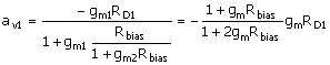 where avd1 and avcm are ( ) and ( ) (with RD1), respectively. For the output Vd2, avd2 is substituted for avd1. Vdm is a pure differential input and is not with respect to ground; the effect from the bias resistor is accounted for in the common-mode gain.