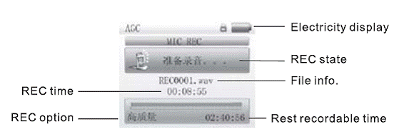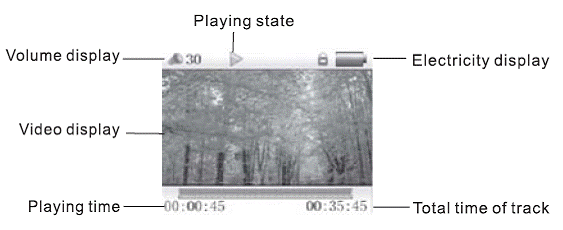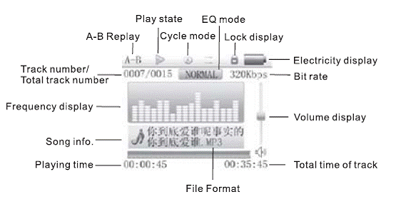 In Music Play menu, connect the earphone with player, select the desire song file by pushing leftwards or rightwards the Five-direction key, then short press [u ] key to being the playing, then short press [u ] key to pause and long press [u ] key for 2 seconds to stop, operate it circularly. During the playing of music, the interface has real audio frequency display, e.g., for the file with LRC file, behind the frequency is the Synchronous Lyric.