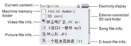 In Main Interface, enter E-Book option, push upwards or downwards the Five-direction key to select the desired file to read, then short press [MENU] key to read. Turn pages by pushing leftwards or rightwards to F.REV and long push rightwards to F.FWD.