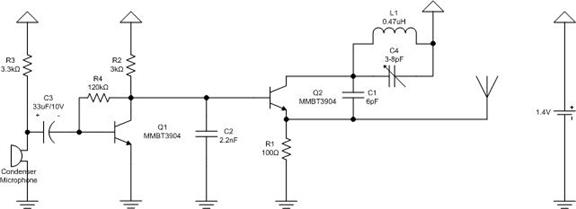 After several rounds of initial testing, the team decided to select an FM transmitter design that did not contain a tunnel diode. Figure 2 shows the circuit chosen for the final design.