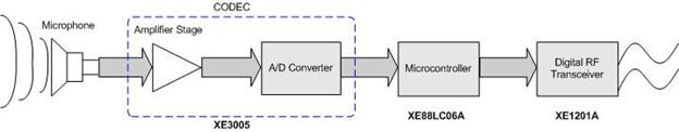 The XE3005 is a very small voice/audio CODEC made by Xemics. It operates on a supply as low as 1.8 volts and is only 6.6 x 6.6 mm in size (XE 3005, 2003, p. 32). These specifications make the XE3005 a good choice for this design.
