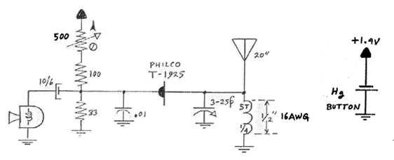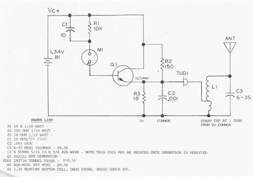 Although transistors have very different characteristics than tunnel diodes, they can still be used in a similar way to produce FM transmission. Transistors, when supplied with varying inputs, will oscillate and amplify the oscillation. In general, the FM transmitter circuits considered that contained only transistors as the active devices had more components than the tunnel diode circuits and required higher operating voltages. However, there were a few designs that met the necessary specifications. Appendix C contains one of the FM transmitters tested that used only transistors for modulation. Although this circuit had poor performance, it was much easier to work with given the availability and simplicity of the components. It became clear that a transmitter requiring no tunnel diodes would be a better option as a long as it met specifications and clearly transmitted voice on FM frequencies.