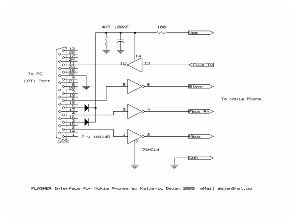 To flash a Nokia phone you need a simply I2C device with 3 wires (don't be surprised that "normal" I2C implementation use the same wires for outputting and inputting, we're not doing that). I2C uses only clock (SCL) and data (SDA) to transmit signals. For more information about I2C check phillips.com. The following wires are used:
