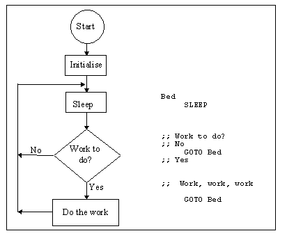 When the PIC starts up, it calls sio_init to initialise the serial module, then calls rx_byte to ready the communications module to receive the first byte. It then enters an infinite loop.