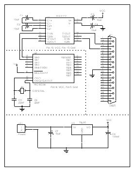 This section shows the implementation of a simple circuit which receives and transmits RS232 data in half-duplex mode. This basic code uses very little of the PIC's capability, allowing the circuit and the software to be extended quite easily. The code for this example is quite small (about 80 instructions in all), yet still illustrates quite a few concepts.
