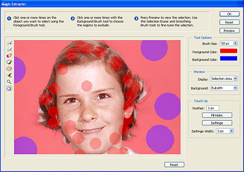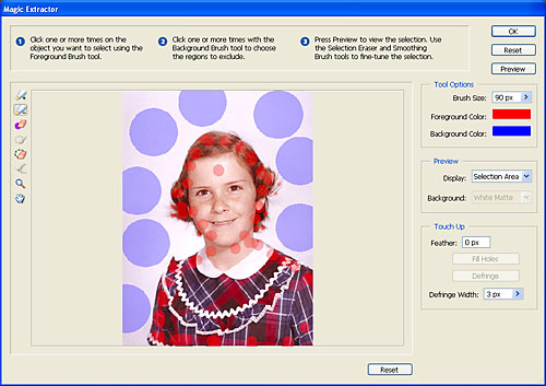 Click the Foreground brush and paint over the person you want to extract with different sized dots. Make sure that you cover areas that look similar in color to the background. To change the brush size while you are painting, press the left bracket key ([) to reduce the brush size, or the right bracket key (]) to increase the brush size. Use small brush strokes to cover delicate areas like the hair fringes that you want to retain. If you make a mistake, use the Point Eraser tool to remove the errant point.