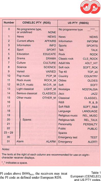 er may be given with PTYN. The PTYN is not intended to change the default eight characters which will be used during the search, but only to define more clearly the programme type once tuned to a programme. If the broadcaster is satisfied with the default PTY name, he will not need to use data transmission capacity to change the default name. Receivers that implement the PTY feature should allow the user to select one of the two different PTY tables (European CENELEC version and US RBDS version). The table may also be switched automatically using the Extended Country code (ECC). |