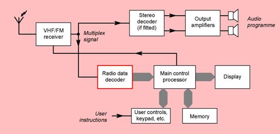 RDS and the three components of RBDS (RDS, MMBS and IRDS) also have in common exactly the same data broadcast signal modulation characteristics. This is a suppressed 57 kHz subcarrier which is PSK modulated with a data-stream of 1187.5 bit/s and identical baseband coding, and with data synchronization strategy optimized for mobile reception. Consequently, the same hardware for data demodulation and display can be used, and suitable radio data decoder ICs are now currently available from several manufacturers at very competitive prices, because several million of these chips have already been sold. Consequently the question of adaptation becomes entirely a matter of software, apart from the additional memory needed to implement RBDS in its more complete form. A block diagram of a typical VHF/FM radio-data receiver is shown in Fig. 5. |