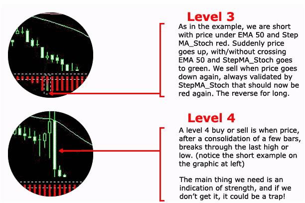 Level 4 is when price, after a consolidation of a few bars, breaks through the last high or low. The main thing we need is an indication of strength, and if we don't get it, it could be a trap!