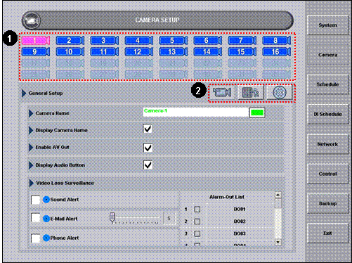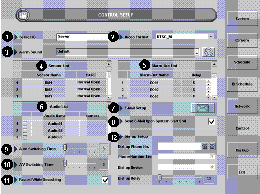 6. Audio List : Shows audio list. You can enter the name of sensor instead of Audio##. And can camera no. to be mixed with the audio recording. You must select camera no. per each audio port in order to use audio function.