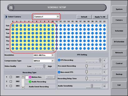 Schedule Setup mode allows you to set recording schedule for each camera.