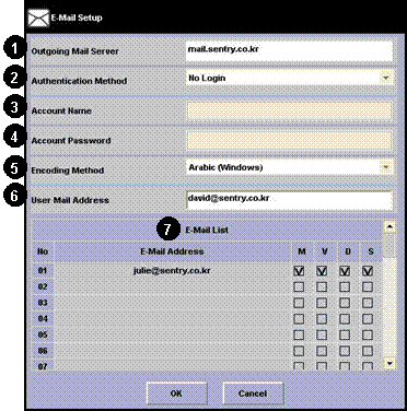- E-mail : sends e-mail with captured image to registered address (Refer to E-mail Setup)