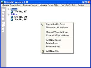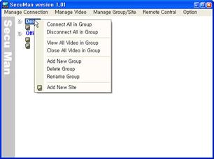 Connection to remote sites should be made before viewing the videos from remote site. Use "Manage Connection Tab" of SecuMan or use the menu after right-mouse click on the group or the site.