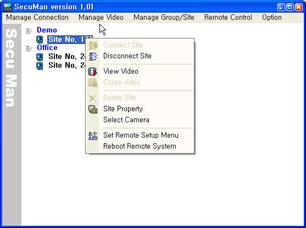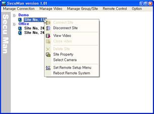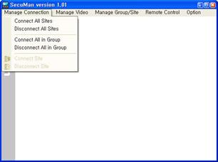 Connection to remote sites should be made before viewing the videos from remote site. Use "Manage Connection Tab" of SecuMan or use the menu after right-mouse click on the group or the site.