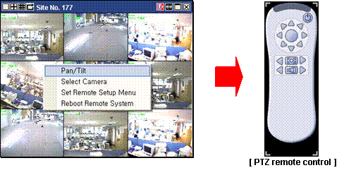 To control PTZ of the camera at remote site, right-mouse click on the window and select "Pan/Tilt". Then PTZ remote control will pop up. Or click Pan/Tilt button on the right top of site viewer window.