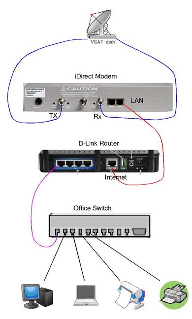 LAN port of the iDirect modem connects to INTERNET port of the D-Link router using a standard network cable (twisted pair, RJ-45 connector, straight);