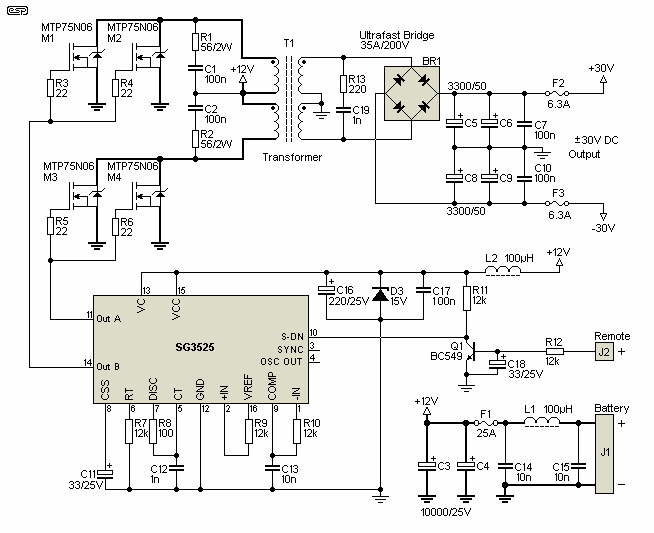 Normally, one would expect regulation as shown in Figure however, using the feedback input of the controller IC relies rather too heavily on the impedance of the DC supply lines. Normally, output inductors are used (with an additional "flyback" diode) to provide a pulse width to voltage converter. The majority of commercial systems seem to use a non-regulated converter, so I would consider that this will be quite acceptable in practice. Tests so far have shown that with a load of about 150 Watts, the regulation was almost entirely dependent on the voltage drop in the supply line!