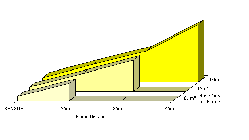 The sensor responds to varying sizes of flame at given distances. The further away the flame is from the sensor the larger the fire has to be, with detection beyond 50m becoming unpredictable. An n-heptane flame with a base area of 0.1m² will be detected on the sensor centre line at 25m, with the sensitivity set high for class 1 performance.