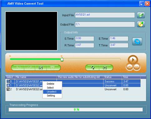 b. Select one or several AMV files, click on mouse right button to make the file's back color to blue.