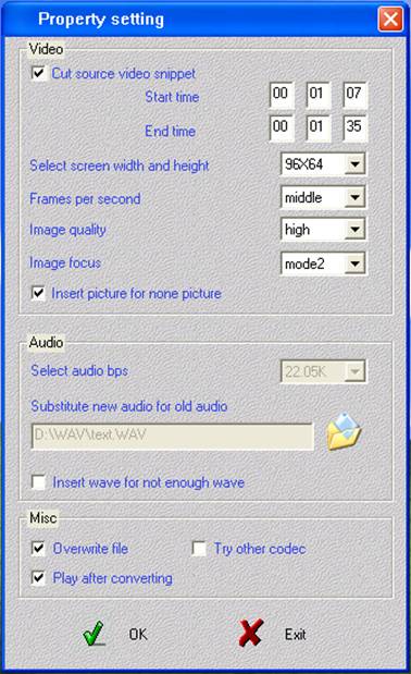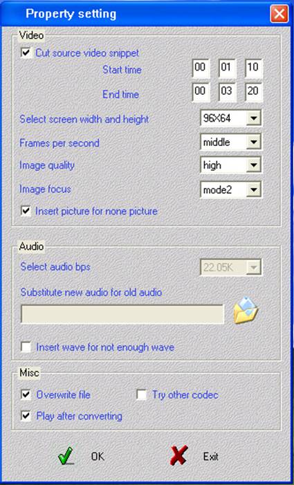 Set up AMV file property, such as cut source video snippet, screen width and height, frames per second and so on.