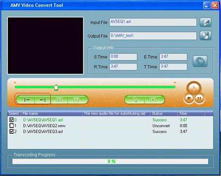 When playing AMV file, there will display the corrective information of AMV file on the Output Info column such as: Star time, End time, Running time, total time. The two of "beginning location" and "finish location" button will valid at the same time. Please refer to the following picture: