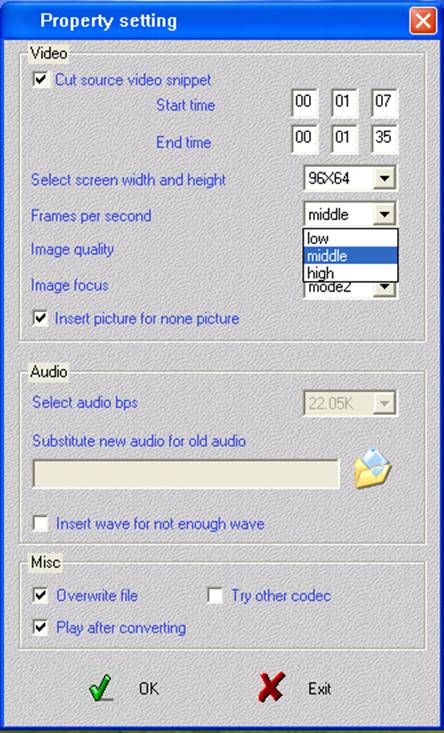 There're three types as high, middle, low. The transferring tool is defaulted as middle If the video quality of AMV file is not clear, you can try to change this setup. The menu display is as following:
