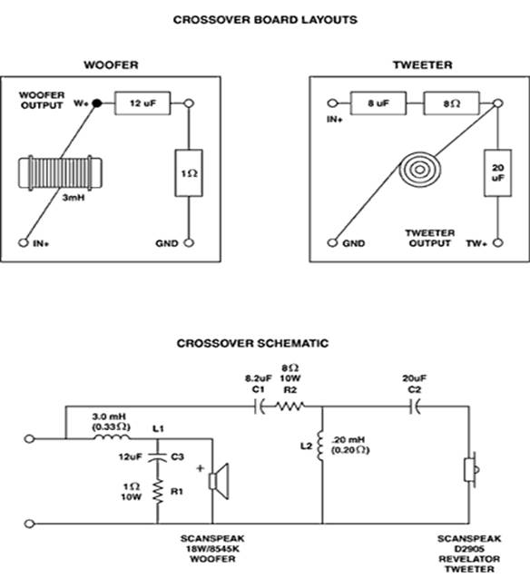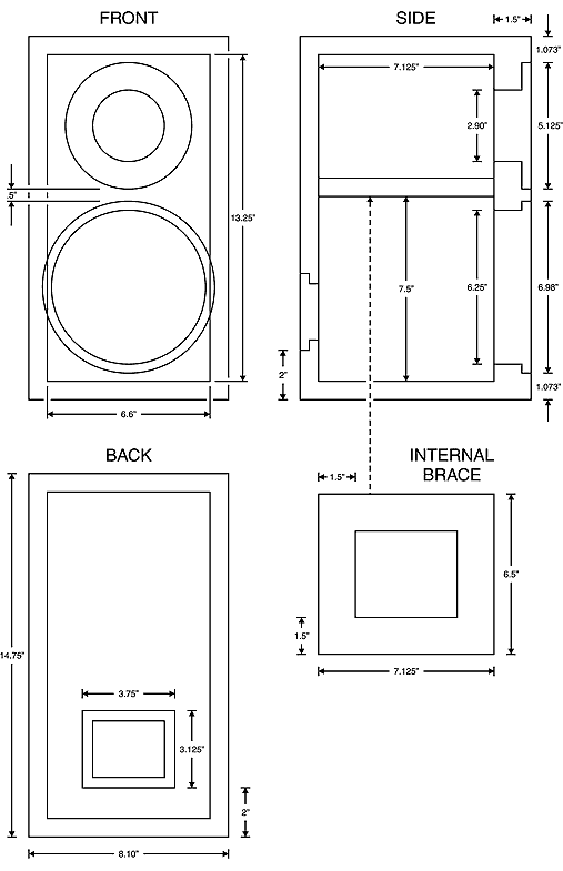 The cabinet is a acoustic suspension design with a net internal volume of .28 cubic feet with internal dimensions (HWD) of 12.5" x 6.5" x 7.125" with substantial interior bracing. All sides and back are 0.75" MDF and the front baffle is 1.125" with inset drivers. The cabinet is filled with 100% Acousta-Stuf polyfill (Item #260-317). It is recommended to separate both high-pass and low-pass crossovers due to space restraints. This method will also eliminate crossover coupling between inductors. For a detailed instructional write up on this high quality kit order a copy of Vance's latest version of the Loudspeaker Design Cookbook 500-034.