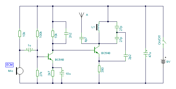 in this circuit. Although not strictly RF transistors, they still give good results. I have used an ECM Mic insert from Maplin