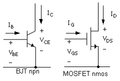 The BJT terminals are designated collector, base, and emitter while those of the MOSFET are drain, gate, and source. The terminal configurations in Fig. 2.1 are, for the BJT, the common emitter, and for the MOSFET, the common source, in amplifier-stage parlance. This suggests that both the input (left side) and output (right side) are referred to the common terminal. For example, for the BJT, the input terminal voltage is VBE and the output terminal voltage is VCE. Similarly, for the MOSFET, we have VGS and VDS. Note that in the convention of subscripts in electronics, the first subscript is assigned positive. This matches the assignments in the diagram, and the plus and minus signs are superfluous.