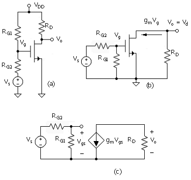 An example of the application of the transconductance relation for the transistor is the basic circuit in Fig. 2.4. Setting dc voltages (in this case, VDD) equal to zero in Fig. 2.4(a) leads to the signal (or ac) circuit [Fig. 2.4(b)]. This follows from the fact that the signal circuit involves only incremental variables (changes) and VDD is a constant.