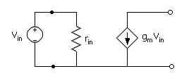 The expression ( ) suggests the linear model given in Fig. 2.2. Included in the model is an input resistance, rin, which accounts for the fact that there can be an incremental current flowing into the input terminal for an increment of input voltage. The model applies in general to amplifying devices, including the vacuum tube (VT), BJT, JFET, and MOSFET. There exists a wide range of magnitude of transconductance and input resistance between the devices. The input resistance, though, affects only the loading of the input signal source; otherwise, the relation of ( ) applies in all cases, and the transconductance is the key to the gain for a given device type. The input resistance is essentially infinite for the vacuum tube and the MOSFET (common source) but can be as low as a few ohms in some configurations for the BJT (e.g., common base).
