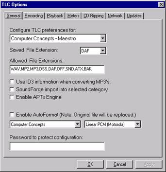 After the software is installed, step through the Tools -- Options dialogs and setup initial operating values. Among the items you'll want to set is Configure TLC for Computer Concepts - Maestro on the General dialog. The Saved File Extension should be set to "DAF" for Maestro systems. If you will be converting other audio files to DAF files, make sure the source file extension type is in the "Allowed File Extensions" list; if it is not, simply click in the box at the end of the list, add a comma, space and the new extension.