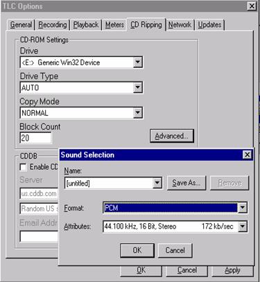 Next, you need to decide if you wish to use the CDDB (Internet CD Database) feature. If so, place a check mark in the box. This feature is useful if your TLC workstation is attached to the Internet and if the majority of CD's you will be ripping are commercially distributed. When checked, it will query an online database of CD titles for a matching CD. If found, it will automatically fill in the title, artist and length fields of the CD. If there is no entry for the CD in the CDDB, you will be prompted accordingly and need to fill in the information manually. You will need to specify an email address to use this feature. Note: a VALID email address is NOT necessary. only a properly FORMATTED email address, i.e. [email protected].