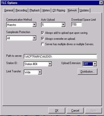 The Network dialog is very important. Set the communication method to Maestro regardless of your network configuration. Samplerate Protection should be set to "All". Path to server is required to upload audio from TLC to your Maestro enterprise (note that in peer to peer Maestro enterprises, this will be a path to the machine that will "OWN" the audio). It is preferred to utilize a UNC path to the server (\\servername\share), however if you have a persistent mapped drive to the upload path, you can use that as well. The Station ID establishes cart ownership within Maestro. The upload extension can be set to DFF or DAF. If you are sending a file to a Maestro surface to have it automatically identified and added to the cart inventory, use DFF. If you are uploading to an Imports folder on a Windows based ACP server, use DAF. Distribution sets the default distribution settings, which are placed in the DAF header of the uploaded files. Distribution is based on Station NODE as defined in your Maestro Configuration file.
