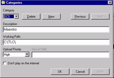 You must define at least one Category to use TLC. These are locations where files are ripped from CD or where MP3 or WAV audio are stored when you use TLC. Computer Concepts recommends ripping and converting audio ONLY to a local hard drive surface. Create Categories under Tools -- Categories on the TLC menu bar. While not necessary for proper TLC operation, by defining individual categories for different types of audio, management of files is enhanced. For instance, you could place all your raw MP3 commercials in one category, ripped music from CD in another, long form programming in yet another and so on.