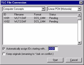 Begin by selecting the category where raw MP3 or WAV files are stored. Next select the file or files that you wish to convert and with the files highlighted click on the FORMAT icon on the TLC toolbar. The first time you use the file format converter, you will need to specify that files should be saved in Computer Concepts format and if using compression, your specific compression scheme. Click in the ID field area and assign a valid Maestro cart number for the audio. Click "Start" and the file (or files if multiple files are selected) will be converted.
