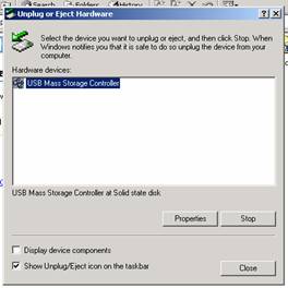 Double click the "safe removal" icon; the "Unplug or Eject Hardware" window will pop up. You can select the device you want to remove. Then, click the "Stop" button. After that you can unplug the device from the USB port of your computer.